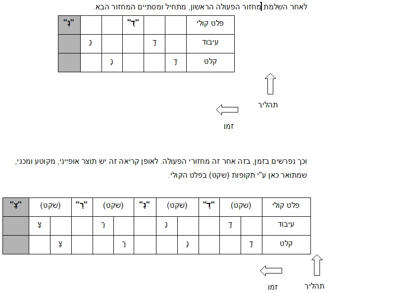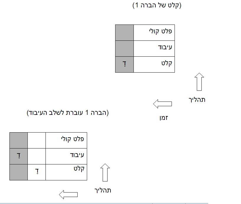 תהליך בסיסי של מחזורים עוקבים אפשר להציג בגרף שמתאר את פריסת הפעולות בזמן. העמודה האפורה מתארת את הפעולה בזמן נתון.